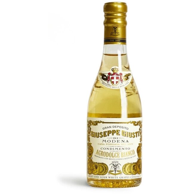 De Giuseppe Giusti Agrodolce Bianco witte balsamico azijn is een verfijnde en frisse variant van de klassieke balsamico. Deze witte balsamico wordt geproduceerd in Italië volgens traditionele methoden en staat bekend om zijn zachte, lichtzoete smaak zonder de donkere kleur van traditionele balsamico.