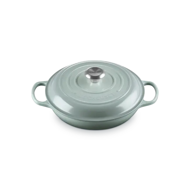 De Le Creuset Campagnard braadpan in Sea Salt is een ondiepe, geëmailleerde gietijzeren braadpan die perfect is voor bakken, braden en langzaam sudderen. Dankzij de brede bodem en lage randen kun je vlees en groenten mooi bruinen, stoofpotten laten garen en zelfs roerbakken of karamelliseren.