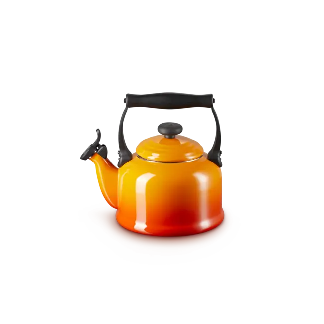 De Le Creuset Tradition fluitketel van 2,1 liter in oranjerood brengt tijdloze charme en functionaliteit samen in jouw keuken. Deze klassieke waterketel fluit zodra het water kookt, zodat je precies weet wanneer je thee of koffie kunt bereiden. De brede, extra sterke bodem zorgt voor een snelle en efficiënte opwarming op alle warmtebronnen, inclusief inductie.