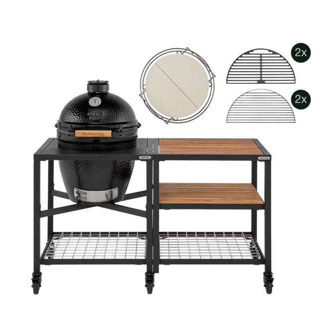 Deze set is perfect te combineren met een Big Green Egg modulaire buitenkeuken, speciaal ontworpen voor de Big Green Egg The Onyx Large. Deze buitenkeuken is gemaakt van stevig staal en afgewerkt met een hoogwaardige mat zwarte poedercoating, waardoor hij perfect aansluit bij de luxe uitstraling van de Onyx.
